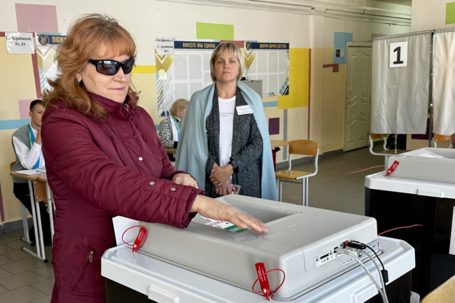 На избирательном участке 1507 в школе № 85 Екатеринбурга проголосовала Татьяна Кирьянова. Ее сопровождал муж Игорь и собака-проводник Жохар. За специальной ширмой (оборудованное место для голосования избирателей с ограничениями здоровья) она прослушала аудиобюллетень, после чего сделала свой выбор.