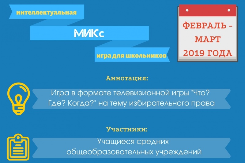 «МИКс» – череда игр на тему избирательного права по принципу телевизионной игры "Что? Где? Когда?". Руководитель проекта: Ольга Молоствова