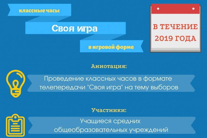 «Своя игра» – организация и проведение классных часов в формате телепередачи "Своя игра" во вопросам организации избирательного процесса. Руководитель проекта: Николай Братанов