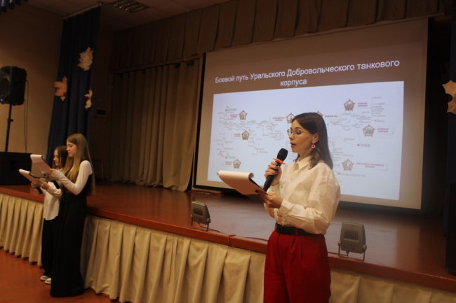 Встреча была посвящена Уральскому добровольческому танковому корпусу. Школьники посмотрели презентацию об основных этапах создания Уральского добровольческого танкового корпуса, а также об его участниках – арамильцах. Презентацию подготовили ученицы 8 «Б» класса Баженова Элина и Лейер Кристина, изучив материалы в городском краеведческом музее.