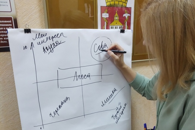Во второй части обучающего мероприятия председатель ТИК провела тренинг по управлению конфликтами, на котором участники ознакомились с одной из классификаций стратегий поведения в конфликте и рассмотрели стили поведения человека при использовании той или иной стратегии.