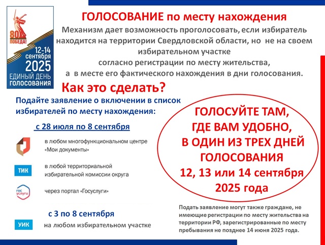 С 28 июля 2025 года начинается прием заявлений о включении избирателя в список избирателей по месту нахождения, а также заявления об аннулировании включения в список избирателей по месту нахождения, при проведении досрочных выборов Губернатора Свердловской области 14 сентября 2025 года.