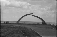 Б. Кудояров. Фотография черно-белая, мемориал «Разорванное кольцо», расположен на западном берегу Ладожского озера.