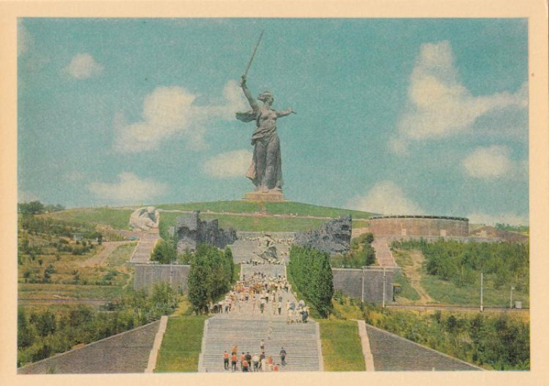 Фотооткрытка цветная, из набора «Город-герой Волгоград». Мамаев курган. Фото Г. Зельма, Дм. Бальтерманца. Издательство «Правда», Москва, 1967 г. Типография газеты «Правда», тираж 650 000.