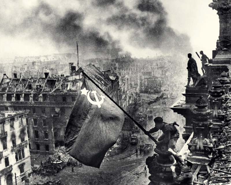 Халдей Евгений Ананьевич. Негатив. Водружение Красного знамени над Рейхстагом 2 мая 1945 г.