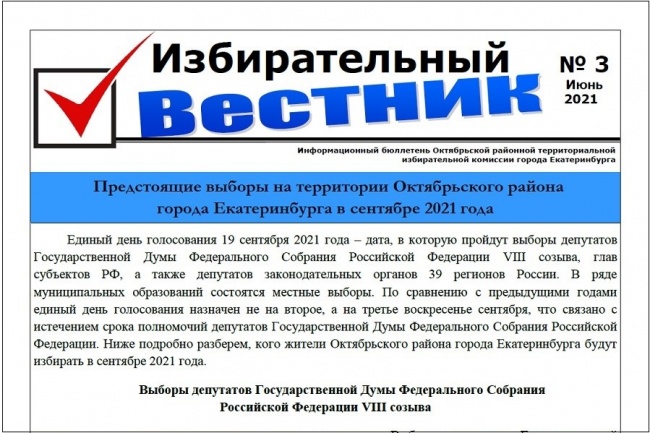 Октябрьская районная территориальная избирательная комиссия города Екатеринбурга выпустила третий Информационный бюллетень «Избирательный Вестник». Он посвящен предстоящим выборам депутатов Государственной Думы Федерального Собрания Российской Федерации VIII созыва и выборам депутатов Законодательного Собрания Свердловской области, проходящим на территории Октябрьского района города Екатеринбурга.