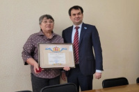 Депутат Заксобрания, заместитель председателя комитета по вопросам законодательства и общественной безопасности Аксенов Игорь Владимирович вручил Почетную грамоту Законодательного Собрания Свердловской области Балдиной Елене, председателю участковой избирательной комиссии избирательного участка № 1982.