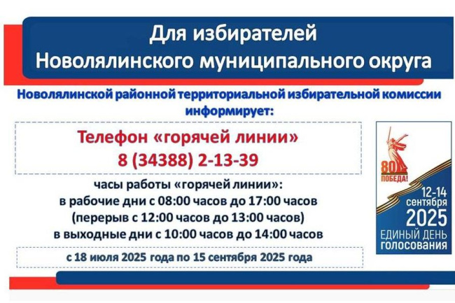 Телефон «горячей линии» Новолялинской районной территориальной избирательной комиссии 8(34388)2-13-39. Режим работы: в рабочие дни – с 8:00 час. до 17:00 час. (перерыв с 12.00 час. до 13.00 час.), 11, 12, 13 сентября 2025 года – с 8:00 час. до 20:00 час.; 14 сентября 2025 года – с 7:00 час. до 21:00 час.