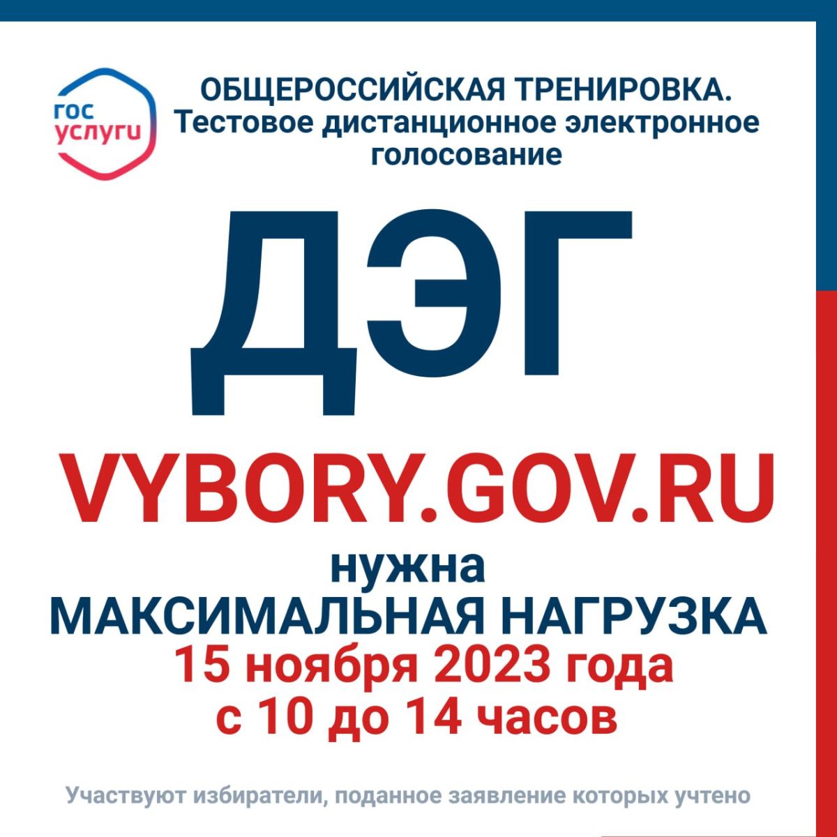Сделать это просто: примите участие в тестовом ДЭГ 15 ноября 2023 года с 10 до 14 часов местного времени. Нам нужна ваша помощь и концентрация обращений.