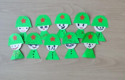 На память о встрече О.А. Соколова раздала маленьких солдатиков, лица которым ребята должны были нарисовать сами, а детский сад подарил председателю значок с эмблемой акции.