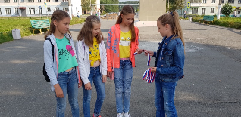 В рамках акции «Триколор» всем участникам были подарены трёхцветные ленточки. Оказалось, что многие не знают, что историческим государственным флагом России считается бело – сине – красный флаг, который был поднят на первом русском корабле «Орел» во время царствования Алексея Михайловича в 1667 году. Белая полоса означала Свободу, синяя – Богородицу, красная - Державность. С течением лет цвет флага неоднократно менялся: Александр II в 1865 году издал Указ, в котором цвета черный, золотой и белый названы «государственными цветами России». Такой флаг просуществовал до 1883 года. 28 апреля было объявлено повеление Александра III, в котором говорилось: "Чтобы в тех торжественных случаях, когда признается возможным дозволить украшение зданий флагами, был употреблен исключительно русский флаг, состоящий из трех полос: верхней - белого, средней - синего и нижней - красного цветов". 8 апреля 1918 года председатель ВЦИК Свердлов предложил утвердить национальным символом страны красный флаг. Соответствующий декрет был подписан 14 апреля. На полотнище флага были расположены золотые буквы "Российская Советская Федеративная Социалистическая Республика".