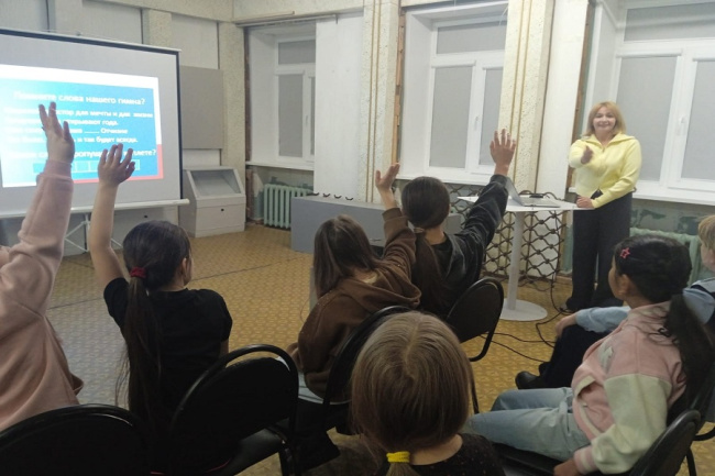 Участники отвечали на вопросы о государственных символах, традициях и законах нашей Родины. За правильные ответы ребята получали сладкие призы. В завершении встречи председатель ТИК Наталья Макарова подарила детям календарики и торт.